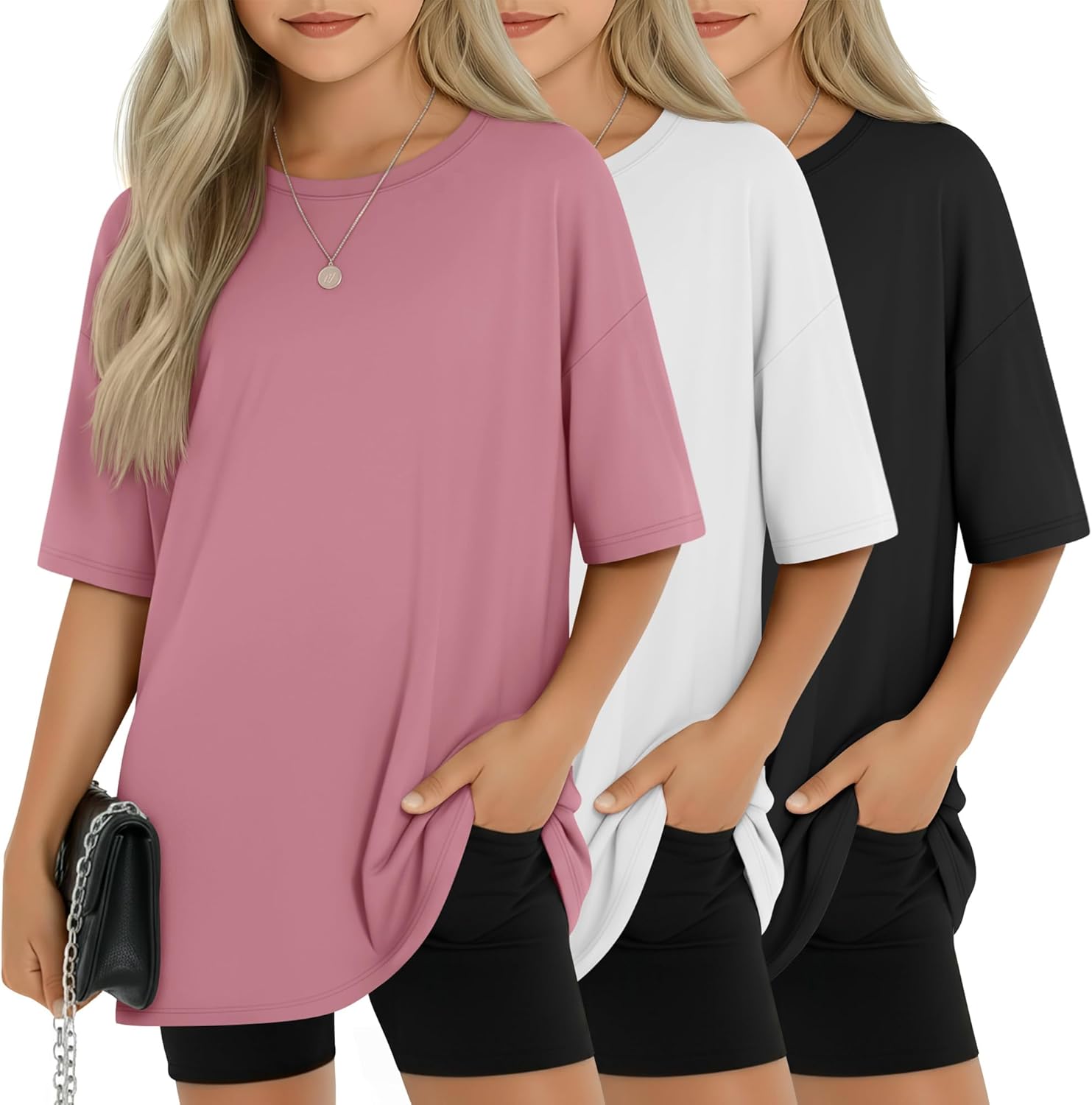 3 Pack Girls Oversized Shirts Kids Short Sleeve Crew Neck Tops Trendy Summer Basic Tees Loose Fit 5-14 Years