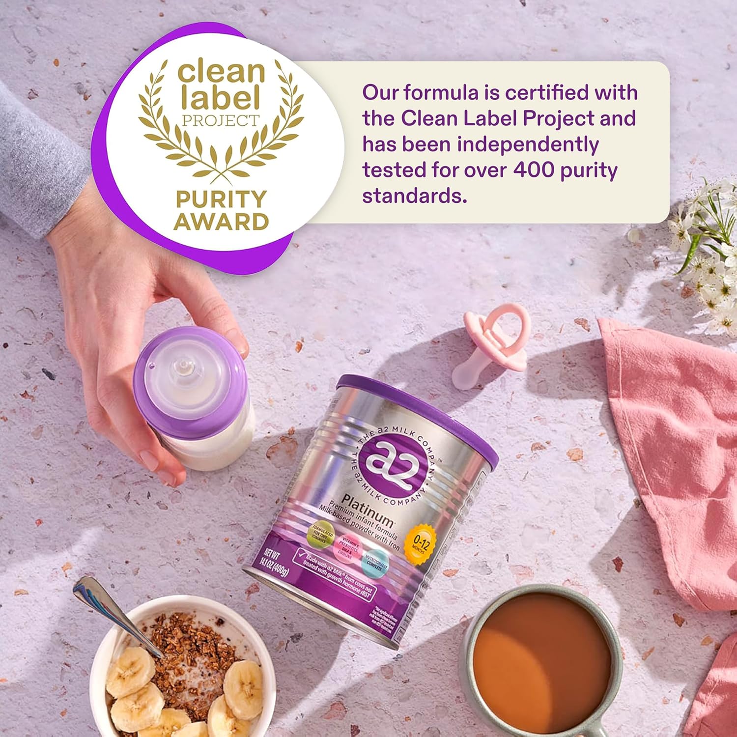 Trusted infant formula: With over a decade in the infant formula industry, our mission is to nourish the lives (and tummies) of babies worldwide through our complete and nutritious formula made with pure and natural a2 Milk. THE a2 Milk DIFFERENCE The primary ingredient in our Platinum a2 infant formula is pure and natural a2 Milk, sourced from cows that naturally produce only the A2 protein. COMPLETE NUTRITION Our premium formula provides the essential nutritional foundation your baby needs to reach critical milestones in their first year. EXCELLENT FOOD SAFETY RECORD Our team prioritizes quality and safety above all else. We guarantee the highest product quality with rigorous food safety standards. Platinum a2 is proudly labeled with a Clean Label Project™ Purity Award and Certified Clean Label. FOR DELICATE STOMACHS Platinum a2 is designed for sensitive tummies, using a2 milk. Our formula is nutritionally complete with key ingredients to support growth and development. Over 30 carefully selected nutrients.