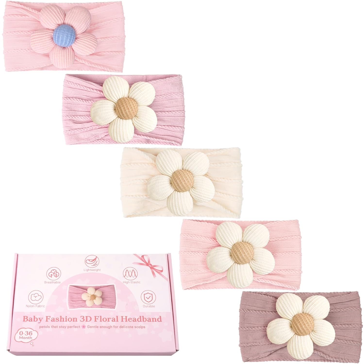 Package Includes - Baby headbands including 5 colors (Beige Pink Khaki, Ginger, Cameo) to fit different outfits! Easy dressing your baby girl up for a special event or simply adding a charming accent to her everyday look? These gorgeous headbands will be the fashionable finishing touch! Premium Quality Materials - baby newborn headbands was made of 85% nylon and 15% spandex which have a great elasticity to grow from newborn infant to toddler and even big girls, the super soft and comfortable flower headbands for girls won't slip off and leave any red skin marks on your little girl's head! Baby girl Essentials - The Must-have Infant headbands are gift hair accessories for baby girls, Take newborn photo props, and wearing it for baby showers, Spring Festival, birthdays, pageants, Easter parades, Christmas events, or other special occasions Daisy Flower Design - No mater she wear it all day or after washing, The nice flower and baby nylon headbands will keep the original shape, reliable and practical companions for her whole babyhood and childhood! Warming Tips - Please stretch the head band to the right size of the baby's head, then gently put it on her head, and the last, You just need to adjust the flower to a perfect position.