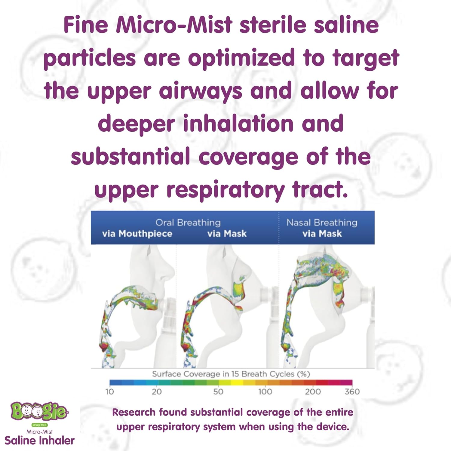 Discover the innovative Boogie Micro-Mist Saline Inhaler, designed to help alleviate upper respiratory congestion and discomfort. Its continuous fine mist delivers sterile, natural saline solution throughout the nasal passages and sinuses, providing soothing relief for various upper respiratory conditions such as coughs, colds, and allergies. The advantage of this device lies in its ultra-fine saltine particles, optimized to target the upper respiratory tract and penetrate deep into nasal passages, offering substantial coverage compared to traditional nasal sprays.