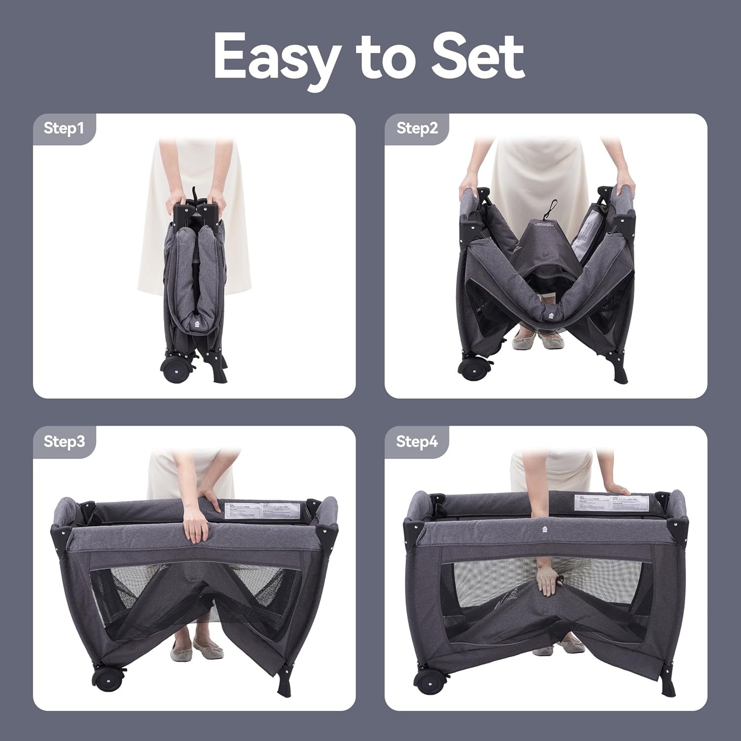 🛋️ Smooth Mobility: Two lockable wheels make moving this playard a breeze. Simply lift and maneuver, then engage the brakes for stability.