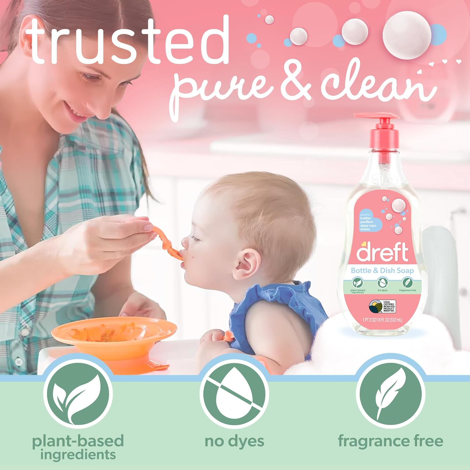 Discover the gentle clean of Dreft's Plant-Based Dish Soap, specifically designed to safely remove milk residue from baby bottles, sippy cups, pacifiers, breast pump parts, and utensils. Trusted by parents and dermatologists, this hypoallergenic formula is made of 90% plant-based ingredients, free from fragrances, dyes, and harsh chemicals. (1)