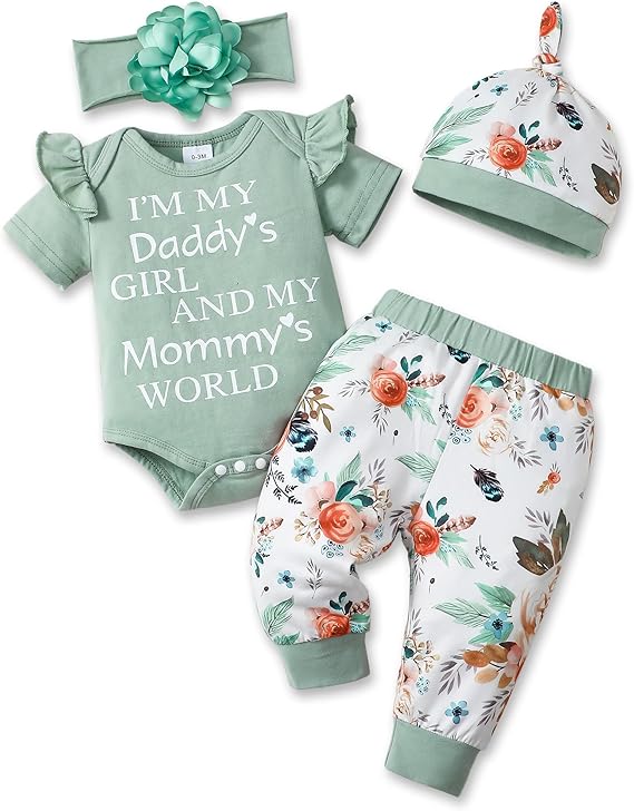 Material---Cotton fabric for baby girls clothes set. Soft and breathable, super soft for baby daily wear or outdoor wear. Great gift for your little one. Cute Baby Girl Outfits---Ruffled layered shoulder, floral pants with elastic waist, matching bowknot headband, adorable 3 pcs spring fall summer clothes for baby girls. Unique Designs---Snap up top for easier diaper changes, delicate and stylish flower pattern and "I'M MY Daddy's GIRL AND MY Mommy's WORLD" words designs, this baby girl pants set will bring your little one happiness and she will get lots of compliments and won’t want to take it off. Size Options---baby clothes girl 0-3months, baby girl clothes 3-6 months, baby girl outfits 6-12 months, 12 18 month girl clothes. Occasion---Adorable baby girl gifts suitable for indoor, outdoor, baby photo, birthday gift, baby shower gifts, New Year, Christmas, coming home outfit, and party or any occasions.