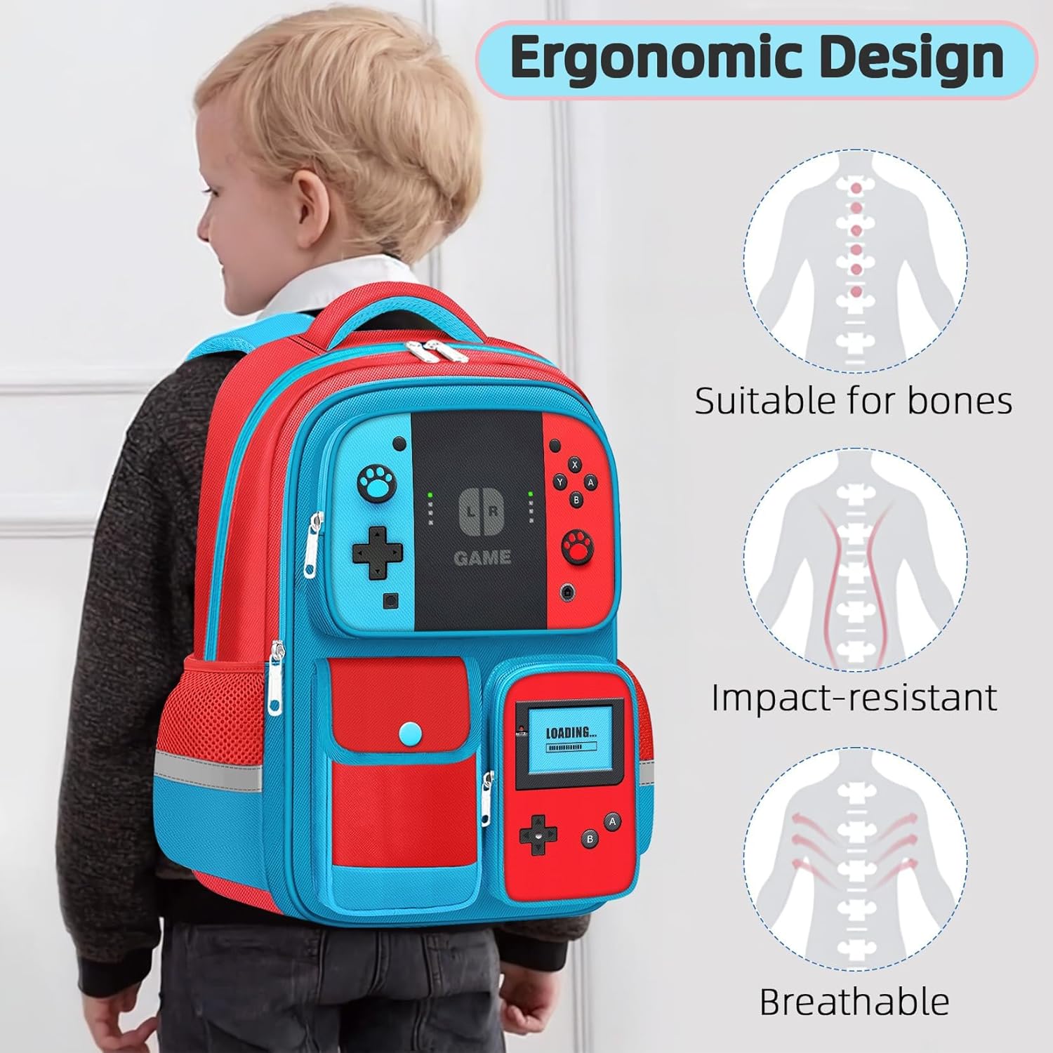 Stylish Gamer Backpack for Kids: 17" Video Game Bag with Red & Blue Accents - Perfect for Elementary & Middle School Students